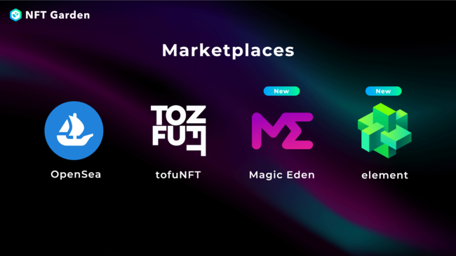NFT Gardenではこれまで『OpenSea』と『tofuNFT』の2つのマーケットプレイスに対応したNFTを生成可能でしたが、今回のアップデートにてSolana NFTの取引量No.1の『Magic Eden』とコミュニティドリブンなNFTマーケットプレイスである『element』の2つのマーケットプレイスに追加対応いたしました。これにより、NFT GardenでNFTを生成する事により、4つのマーケットプレイスに最適化されたNFTを生成する事が可能となります。