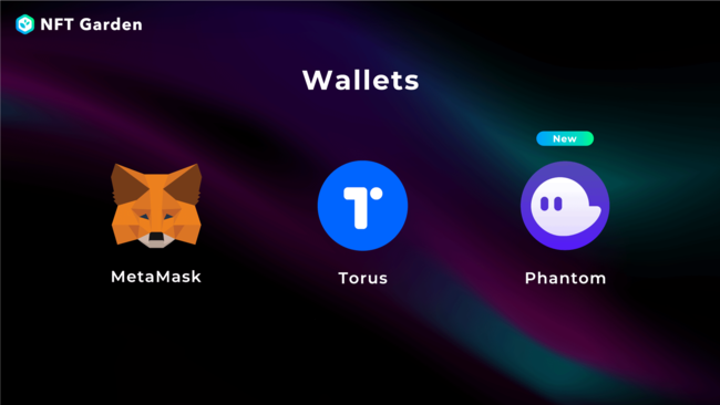 これまでNFT Gardenで使用可能なウォレットは『MetaMaskウォレット』(※7)と『Torusウォレット』の2種類でしたが、今回のアップデートによりSolanaチェーンに対応したことに伴い『Phantomウォレット』(※8)の接続に対応いたしました。SolanaチェーンでNFTを生成する際は、『Phantomウォレット』を接続して生成を行います。