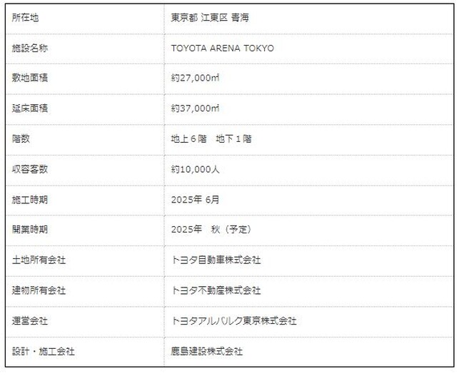 トヨタ自動車株式会社(以下、トヨタ自動車)、トヨタ不動産株式会社(以下、トヨタ不動産)、トヨタアルバルク東京株式会社(以下、トヨタアルバルク東京)の3社で協働して推進する「TOKYO A-ARENA PROJECT (以下、本プロジェクト)」は、2025年秋開業予定のお台場エリア「江東区・青海」に新設するアリーナの施設名称につき、トヨタ自動車がアリーナのネーミングライツ(命名権)を取得し、「TOYOTA ARENA TOKYO」とすることに決定いたしました。