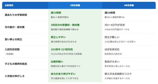 4科目受験では週25時間を勉強に費やしますが、2科目受験なら週15時間。差し引き週10時間の「余白」が生まれます。この余白を、お子さんの「好き」や「得意」を伸ばす時間に充てること--それが、偏差値だけに頼らない、新しい受験の形です。