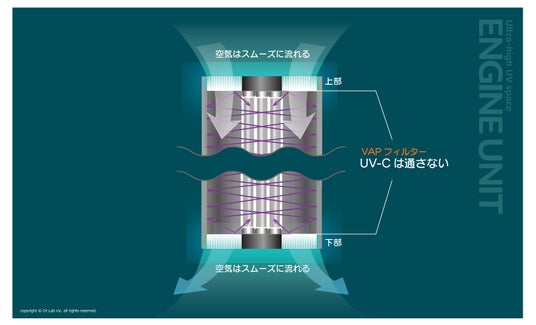 エンジユニットの吸排気箇所には、それぞれ独自開発のUVカット機構(VAPフィルター)を設置し、内部の超高濃度紫外線が外部へ漏れないよう安全性を考慮した構造になっています。