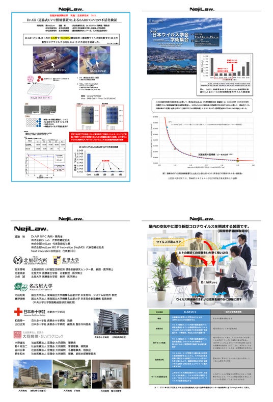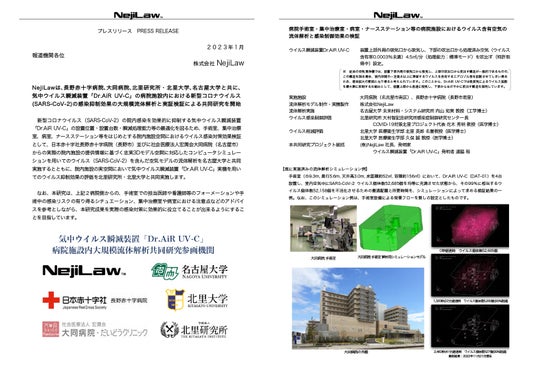【参考】2023/01/25 プレスリリース NejiLawは、長野赤十字病院、大同病院、北里研究所・北里大学、名古屋大学と共に、気中ウイルス瞬滅装置「Dr.AiR UV-C」の病院施設内における新型コロナウイルス(SARS-CoV-2)の感染抑制効果の大規模流体解析と実証検証による共同研究を開始しました。
