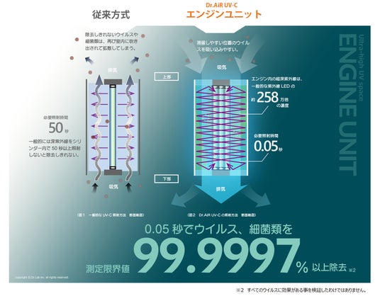 独自開発のUV-C増幅機構(エンジンユニット)により、UV-Cを高濃度に増幅(一般的なUV-C発光LEDの紫外線出力の約258万倍に相当)させ、超高濃度紫外線空間をつくり出すことにより、吸い込んだ空気を装置内部に0.05秒以上かけて通過(ワンパス)させることで99.9997%(測定限界値)以上のウイルス、細菌類の除去を実現しています。