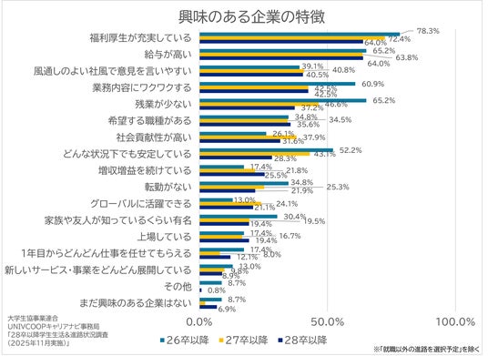 興味のある企業の特徴も回答が分散。「福利厚生」は依然として最重要項目だが、大幅減少(-8.4pt)した。仕事に求めることで「成長できる環境」への回答増加の影響(参照:28卒以降学生生活&進路状況調査(2025年11月実施) 学生生活&キャリア観編)か、「1年目からどんどん仕事を任せてもらえる」も増加しており、企業のサポート力と早期成長環境に注目していると考えられる。本項目は複数回答可としているが、年々1人当たりの選択数が減少しており、特定の条件特定の業界・企業へ学生の興味が集中している可能性がある。【図2】