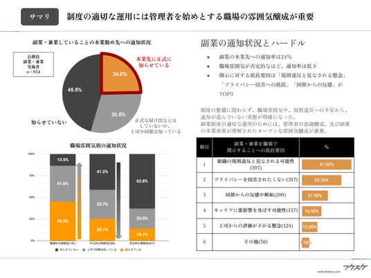 副業の本業先への通知率は24%です。職場雰囲気が否定的なほど、通知率は低下する傾向が見られた。情報開示に対する抵抗要因は「規則違反と見なされる懸念」「プライバシー侵害への抵抗」「同僚からの反感」がTOP3となった。