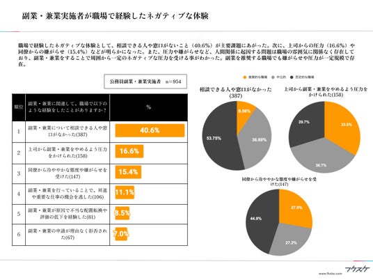 職場で経験したネガティブな体験として、相談できる人や窓口がないこと(40.6%)が主要課題にあがった。次に、上司からの圧力(16.6%)や同僚からの嫌がらせ(15.4%)などが明らかになった。また、圧力や嫌がらせなど、人間関係に起因する問題は職場の雰囲気に関係なく存在しており、副業・兼業をすることで周囲から一定のネガティブな圧力を受ける事がわかった。副業を推奨する職場でも嫌がらせや圧力が一定規模で存在。