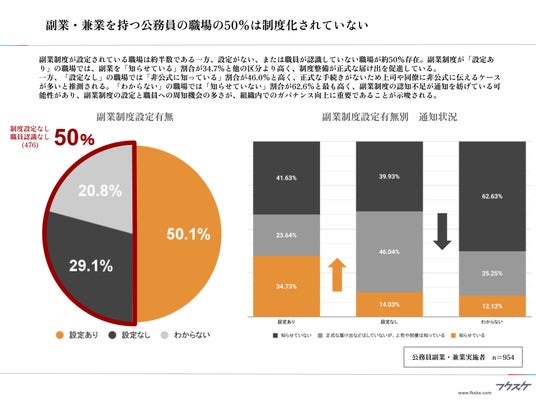 また、高い副業・兼業希望が潜在するなか、副業制度の設定がない、職員が認識していない職場が約50%存在しています。さらに、副業・兼業していることの本業勤め先への通知状況では、45.5%が「知らせていない」と回答しました。制度の未整備や職場の雰囲気が大きな障害となっていることが伺えます。
