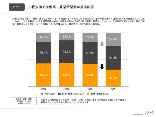 20代と30代では、「副業・兼業をしたい」という回答がそれぞれ42.7%と43.6%で、他の年代に比べて副業に前向きな意識が高いことがわかる。一方で年齢が上がると副業意欲が減少する傾向があり、50代では「副業・兼業をしたい」という回答が31.1%と最低、逆に「副業・兼業をしたくない」という回答が44.4%で最も高く、他の年代に比べて副業に消極的。