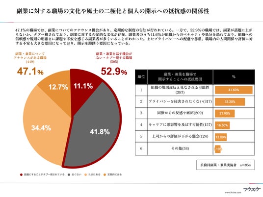 47.1%の職場では、副業・兼業についてのアナウンス機会があり、定期的な制度の告知が行われている。一方で、52.9%の職場では、副業が話題に上がらないか、タブー視されており、副業・兼業に対する否定的な文化が存在。副業者のうち41.6%が組織からのペナルティや処分を恐れており、組織への信頼感や規則の明確さに課題や不安を感じる副業者が多くいることがわかった。またプライバシーへの配慮や尊重、職場内の人間関係や評価に対する不安も大きな要因になっており、開示を躊躇う要因になっている。
