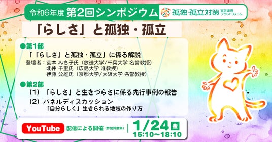 孤独・孤立対策官民連携プラットフォームは、令和7年1月24日(金)にシンポジウム「「らしさ」と孤独・孤立」を開催します。専門家による解説や、NPO等による取組事例を踏まえたパネルディスカッションを通じて、ジェンダーが個々人の孤独・孤立にどう影響するかを知り、対応策等を共有することで、地方公共団体やNPO等が連携し、地域での取組を検討する際の参考となることを目指します。