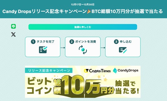 今回、Candy Dropsの正式リリースを記念して、Crypto Timesとのコラボキャンペーンとして、総額10万円相当のBTCが当たるキャンペーンを実施します。