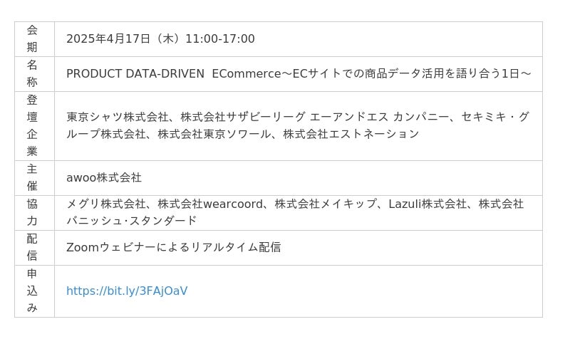 アプリマーケティングプラットフォーム「MGRe(メグリ)」を開発・運営するメグリ株式会社(本社:東京都中央区、代表取締役:田代 健太郎)は、2025年4月17日(木)に開催されるawoo株式会社(本社:東京都渋谷区、代表:林 思吾)主催の【PRODUCT DATA-DRIVEN ECommerce~ECサイトでの商品データ活用を語り合う1日~】に株式会社サザビーリーグ エーアンドエス カンパニーと一緒に登壇します。