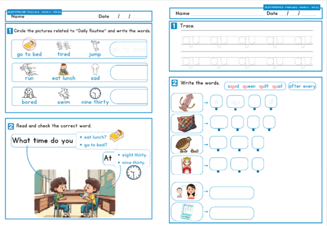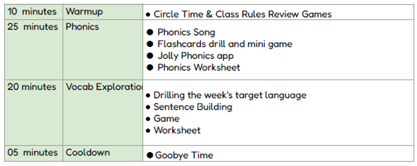 週のターゲットボキャブラリーは3~5ワード、テキストベースでなく『ワークショップ形式』、充分に発音を繰り返したあと、発音と文字の組みたて等をペーパーで確認していきます。