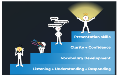 複数の単語を理解し、互いに聞く、話すことで語彙を増やします。それが繰り返されることでセンテンスで表現することが可能となり、最終的には英語でスピーチする力、ディスカッション・プレゼンテーションを通して自分の考えを表現できるようになることを目指します。