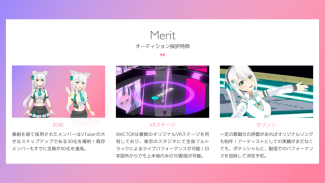Vtuberにとって大きなステップアップである3D化・オリジナルソング・お披露目VRライブを確約した上でデビューができる新人専属Vtuberオーディションを開催いたします。