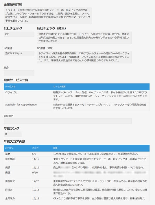 取得した企業情報表示例(トライコーン株式会社の場合)