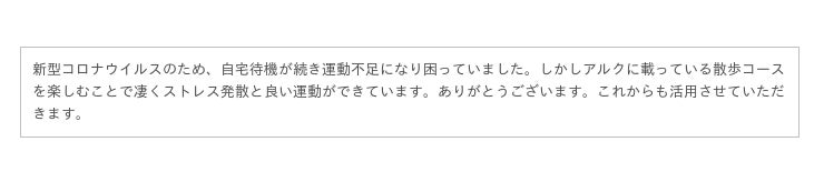利用者アンケートの結果、アルクをほぼ毎日(1週間に4~7日)使う利用者においては、全国調査よりも高い割合で週1回以上の運動習慣があり、日々の健康活動に活用いただいていることがわかっています。