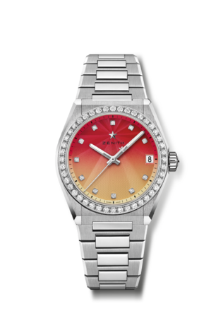 ベゼルにブリリアントカット ホワイトダイヤモンドをあしらった36mmのステンレススチール製ケースを採用し、輝きを放つウェーブパターンのギョーシェ装飾が施された文字盤を備えたデファイ ミッドナイト サンセットは、温かみのあるレッドから深みのあるイエローのトーンにグラデーションになっており、太陽が沈んで夜になる前の最後の光線を放つ瞬間の、あっという間ではあるが息を飲むような空を想起させる見事な色の移り変わりを表現しています。