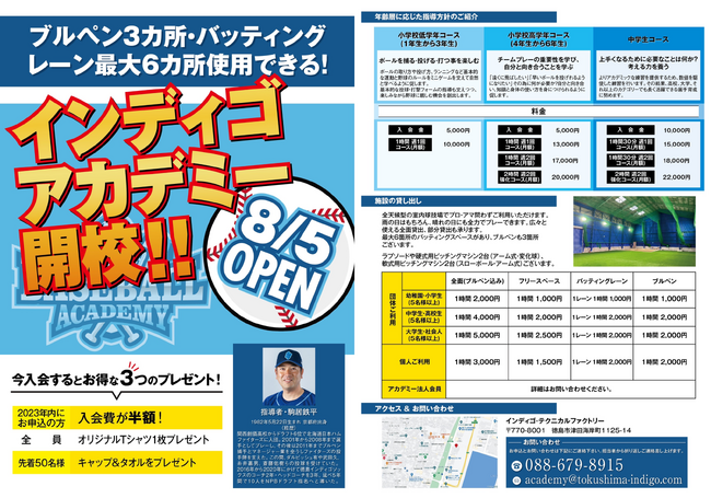 この度、株式会社パブリック・ベースボールクラブ徳島が運営する徳島インディゴソックス球団では、室内練習場をオープンし、野球スクール「インディゴアカデミー」を8月より開校する運びとなりましたのでお知らせい致します。