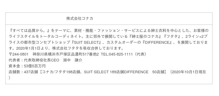 取 扱 店 舗:紳士服コナカ全店舗、紳士服フタタ全店舗、FUTATA THE FLAG