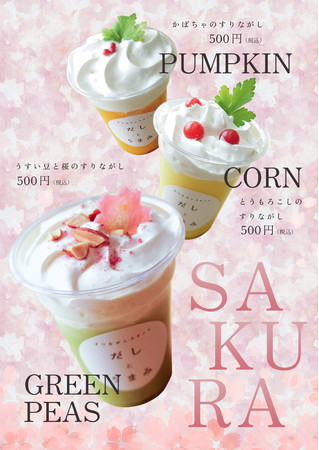 当日のイベントでは、春の新作である「うすい豆と桜のすりながし」に加えて「かぼちゃのすりながし」と「とうもろこしのすりながし」をイベント専用にカスタマイズ。各500円で販売いたします。