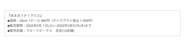 創業98年目のフルーツ専門店「フルーツショップ青木」を運営する青木フルーツホールディングス株式会社(本社:福島県郡山市、代表取締役会長兼社長:青木信博)は、フルーツタルト販売・カフェ運営を行うフルーツピークス(fruitspeaks)(14店舗)にて、大人気の品種「あまおう」と自家製の濃厚なティラミスを組み合わせた、ホワイトデーにおすすめのタルト『あまおうティラミス』を2022年3月1日(火)~2022年3月31日(木)の期間限定で販売いたします。また、高級白いちご「淡雪」を使ったタルト『淡雪といちごのムース』をフルーツピークス プレミアム新宿店限定で2022年3月31日(木)まで販売しています。