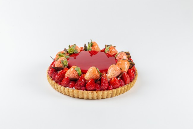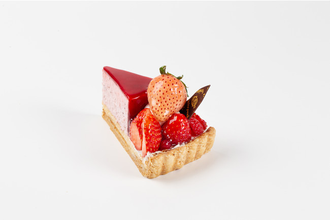 『淡雪といちごムース』は、希少で人気の高い高級白いちご「淡雪」を中心にいちごの花畑をイメージして取り囲むようにラズベリーやレッドカラント、いちごを並べたタルトです。淡いピンク色のいちごムースを真っ赤なグラサージュで鏡面のようにコーティングし、赤と白の2色のいちごの色鮮やかなコントラストが美しい見た目に仕上げました。