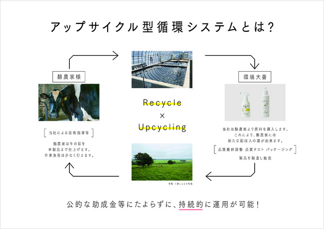 この循環は、酪農家から牛の尿を購入し地域経済を循環させるだけでなく、製品の消費者も自動的に環境危機の解決へ加わる事になり、善の循環を起こす事ができます。