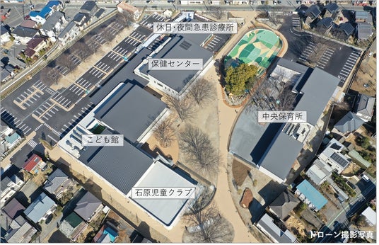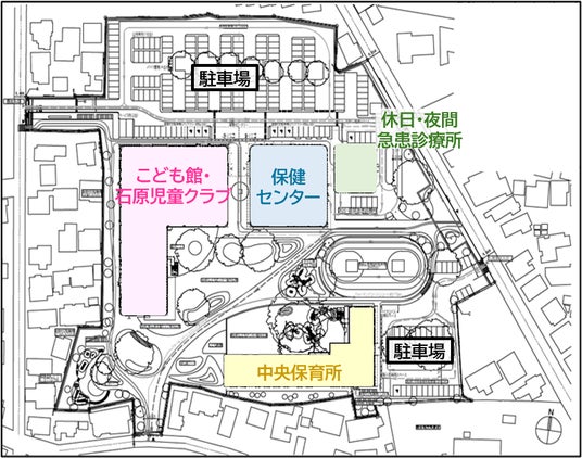 遊び場や相談機能を備えた「こども館」から、定員150人の「中央保育所」、初期診療を担う「休日・夜間急患診療所」まで1ヶ所に集約されます。子育て支援部門と保健部門が一つの敷地の中で連携し、地域的な子育てネットワークを醸成することで、きめ細やかな支援が可能になります。