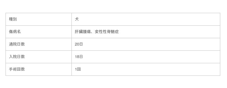 ※下記の診察内容は、犬の肝臓腫瘍(がん)の一般的な診療内容についての記述になり、PS保険にご請求いただいた事案の診療内容とは異なります。