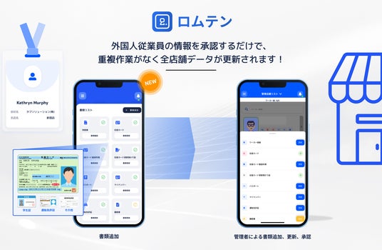 外国人従業員が利用できるスマホアプリとは、外国人従業員自身が「ロムテン」アプリへログインし、在留カード、学生証、パスポートなど必要な書類をいつでも追加・更新できる機能となります。追加・更新された情報を管理者が承認すると、全店舗に一括反映され、複数店舗に所属する外国人従業員の情報が統一化されます。また、在留カードの期限が近づいたら、外国人従業員にプッシュ通知が届き、在留資格の更新を促します。