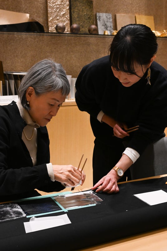箔座の職人から箔の扱いについてレクチャーを受ける須藤玲子。今年は箔押しを施した「こいのぼり」が新たに登場する。