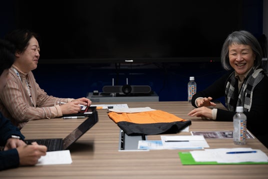 昨年に続き素材を提供する東レにて、作品に使用する高機能素材「uts-fit(R)」を前に打ち合わせをおこなう。