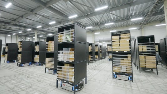 1. AGVが作業ステーションに商品棚を運んできます
