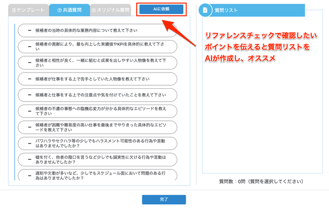 1.リファレンスチェックの質問内容を要望に応じて提案してくれる