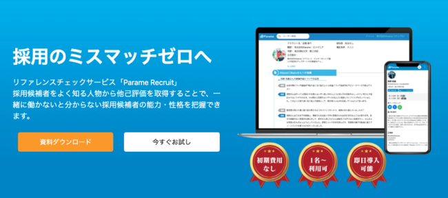 「Parame Recruit(パラミーリクルート)」はオンラインで完結するリファレンスチェック サービスです。採用候補者をよく知る人物から、面接だけでは知れない候補者の性格やスキル面、実績などの候補者の情報を取得し、採用のミスマッチリスクを最小化します。