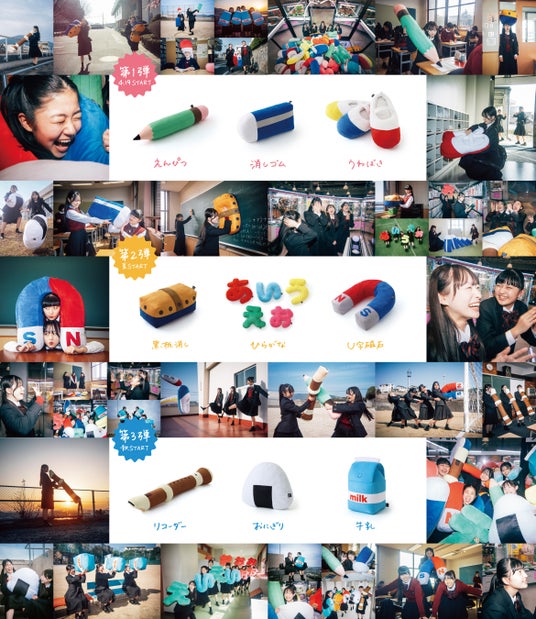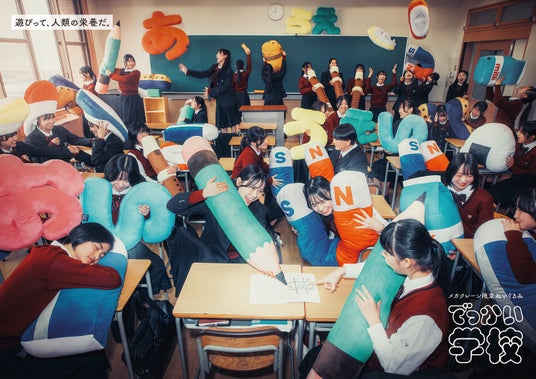 えんぴつ、消しゴム、うわばき、黒板消し、U字磁石など、学校のアイテムが、超巨大ぬいぐるみに!
