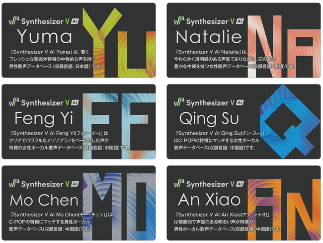 今回発売する歌声データベースも、Synthesizer V Studio Proと組み合わせて使うことで、日本語、英語、中国語での歌唱が可能です。また最新のAI技術により、非常にリアルな歌声を再現することが出来ます。 Synthesizer Vシリーズは、AIに対応してから1年、おかげさまで予想を大幅に超える売れ行きとなっております。現在はプロの方をはじめとして、世界各国の様々な方に使われております。 これからもより一層使って頂けるよう、機能の拡充、また歌声のさらなる充実をすすめてまいります。