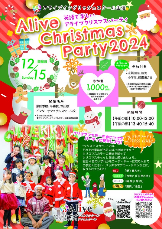 子ども英語・英会話のアライブイングリッシュスクール(株式会社アライブ)は、今年も地域の皆さまとともに楽しむ英語のクリスマスイベント「アライブクリスマスパーティー2024」を開催します。