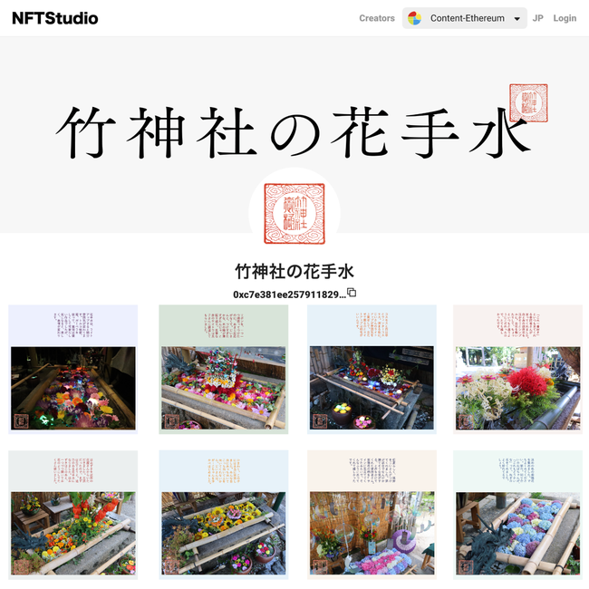 また、同サービスを使った第1弾の取り組みとして、自治体の地方創生支援を行う一般社団法人明和観光商社(三重県多気郡、代表理事:千田良仁)と、三重県明和町の観光振興を図るために、伊勢街道のにぎわいを生み出す観光資源である竹神社が境内に展示している、花々と鮮やかに移り変わる光の演出を加えた幻想的な花手水(はなちょうず)のメモリアルフォトグラフをContent-EthereumのNFTとして、3月15日13:00よりNFTStudioで頒布します。
