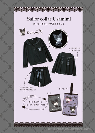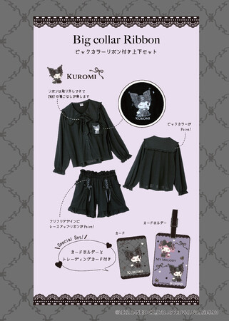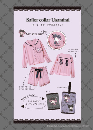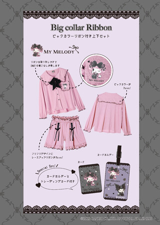 デザインは2種類あり、1.セーラーカラーに編み上げリボンをあしらったうさ耳がついたトップスと、ウエストに大きなサテンリボンが付いたショートパンツのセット、2.ビッグカラーに取り外し可能なリボンが付いたトップスと、編み上げリボンをあしらったショートパンツのセットです。それぞれピンクにはマイメロディのモチーフ、ブラックにはクロミのモチーフがプリントされています。