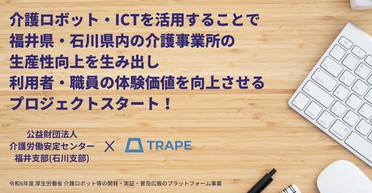 介護における生産性向上ガイドライン作成など、2017年から介護分野の生産性向上のためのさまざまな国の施策づくりで中心的な役割を担い、ウェルビーイングに溢れた介護事業所を創出するために「生産性向上」「働きがい向上」「リーダー育成」の3つを一度に実現することができる生産性向上伴走支援サービス「Sociwell(ソシウェル)」を展開している株式会社TRAPE(本社:大阪府大阪市、代表取締役社長:鎌田大啓)は、この度令和6年度 厚生労働省 介護ロボット等の開発・実証・普及広報のプラットフォーム事業(以下PF)においてPF福井(石川)相談窓口における業務アドバイザー業務委託契約を公益財団法人介護労働安定センター福井支部様と締結いたしました。