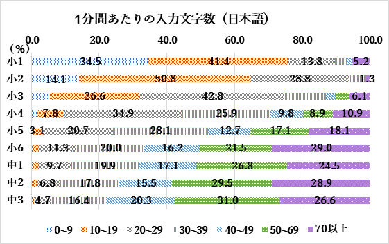 2015年「文部科学省:情報活用能力調査」 :小学校5年生 5.9文字 / 中学校2年生 17.4文字