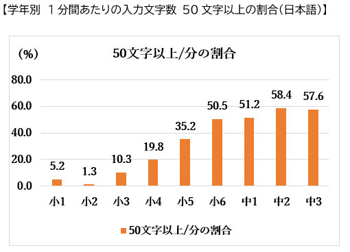 小学6年生以上では、平均入力文字数50文字以上の児童・生徒が過半数を超える