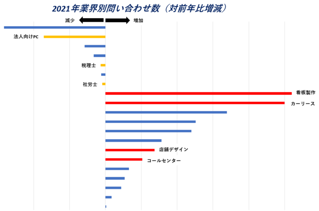 なかでも従来のトレンドと違う動きを見せて問い合わせが増えた業界は、「看板製作」「カーリース」「店舗デザイン」「コールセンター」です。