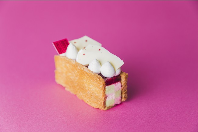 フォションピンクとピスタチオグリーンの市松文様(=ダミエ)が美しいプレミアム・ミルフォイユ。グリオットのコンフィチュールと、幾重にも重なるサクサクのパイ生地。その下には、ピスタチオとフォションピンクのクリームのダミエ柄が。目にも美しく風味豊かな、五感を楽しませるプティガトーです。