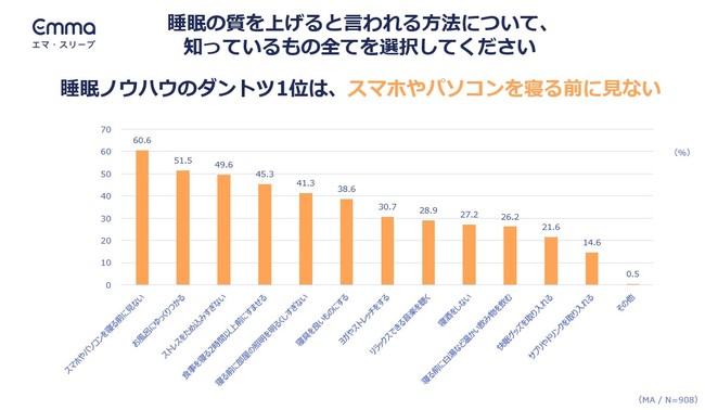 睡眠に関わる製品およびサービスを提供するスリープテック・ブランドEmma Sleep Japan合同会社(本社:東京都港区、代表:マヌエル・ミュラー、以下エマ・スリープ)は、「睡眠の質と睡眠ノウハウに関する意識調査」を、全国の20~59歳の男女1,065人を対象にインターネットで実施しました。