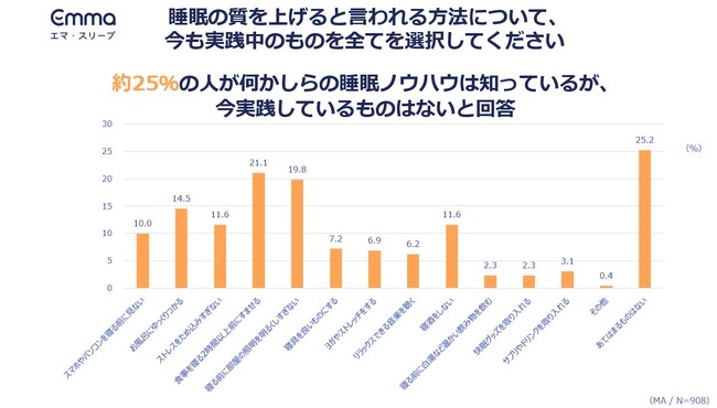一方で、『知っている睡眠の質を上げる方法の中で実践中のもの』を伺うと、約25%が、「現在実践中のものはない」と回答。さらに、約75%の人は、睡眠の質が下がるとわかっていても寝る直前までスマホやパソコンを見ていると回答し、睡眠への意識は高い一方で、仕事や育児など、多忙な現代人にとって、睡眠の質は上げたいが、なかなかノウハウを実践できていない状況が見て取れる結果となりました