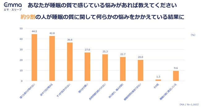『あなたが睡眠の質で感じている悩みがあれば教えてください』という質問に対し、約9割の人が睡眠の質に関して何らかの悩みをかかえていると回答。上位3つには、「寝ても疲れが取れない(44.5%)」、「途中で目が覚める(42.8%)」、「すっきり起きられない(36.6%)」が挙がりました。