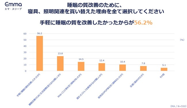 また、『睡眠の質改善のために、寝具や照明関連を買い替えた理由』について伺うと、「手軽に睡眠の質を改善したいから」が56.2%と最多になり、質の高い睡眠をとりたいが、ノウハウは実践できていない人が多くいる結果とも関係する結果となりました。